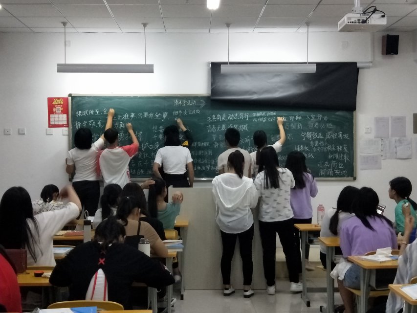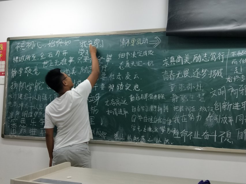 活动开始前,首先由班长带头进行动员,鼓励大家集思广益,结合自己的人生格言和班级实际情况把好的想法和同学们交流沟通,然后把想好的名言警句写在黑板上与同学们分享。活动开始后,同学们都积极踊跃的将自己知道的经典古诗、励志名句写在了黑板上,其中不乏“天行健君子以自强不息”、“精诚所至金石为开”、“细节决定成败”等寓意深刻的语句。