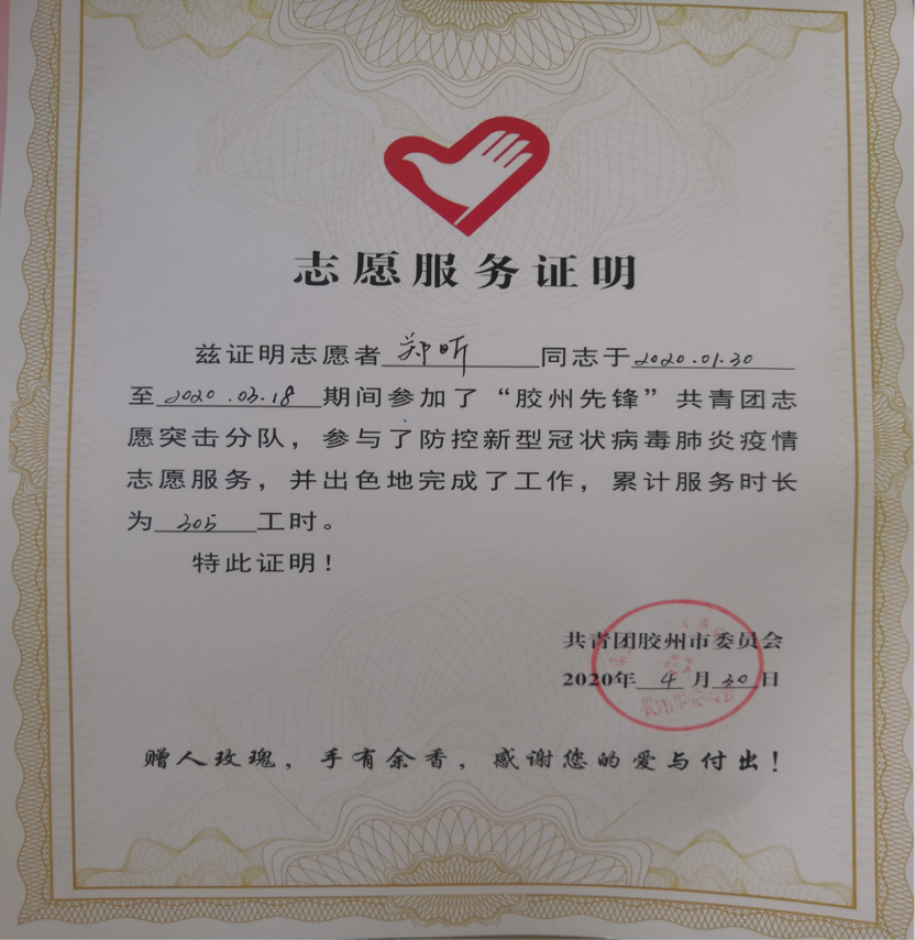 疫情开始之后,郑昕同学主动担当,坚持每天到村里卡点开展志愿服务,对过往车辆和进出的居民进行登记、发放核对出入证帮助开展检测体温和消毒、宣传疫情防控知识等工作。积极配合社区工作人员进行入户排查,共计排查了120户家庭,帮助各个村庄检查点发放疫情防控物资,并对各类信息进行汇总上报,累计志愿服务时长达305小时。近日共青团胶州市委给“胶州先锋”共青团志愿者发来了感谢信,肯定