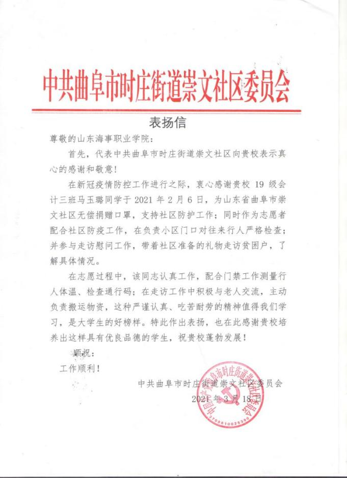 近日,港航学院收到分别来自中共曲阜市时庄街道崇文社区委员会发来的表扬信,分别对我院19级会计3班马玉璐同学在抗疫当中的积极表现给予高度肯定和赞扬。