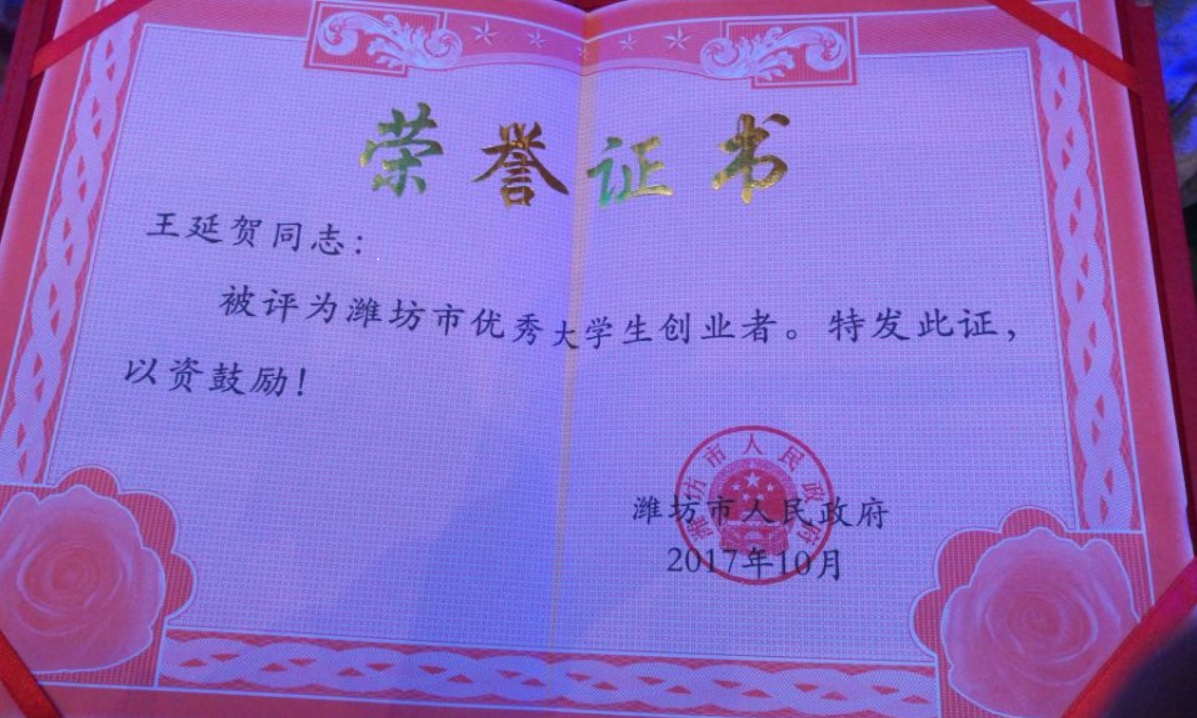 我院学生王延贺被潍坊市人民政府评为潍坊市优秀大学生创业者