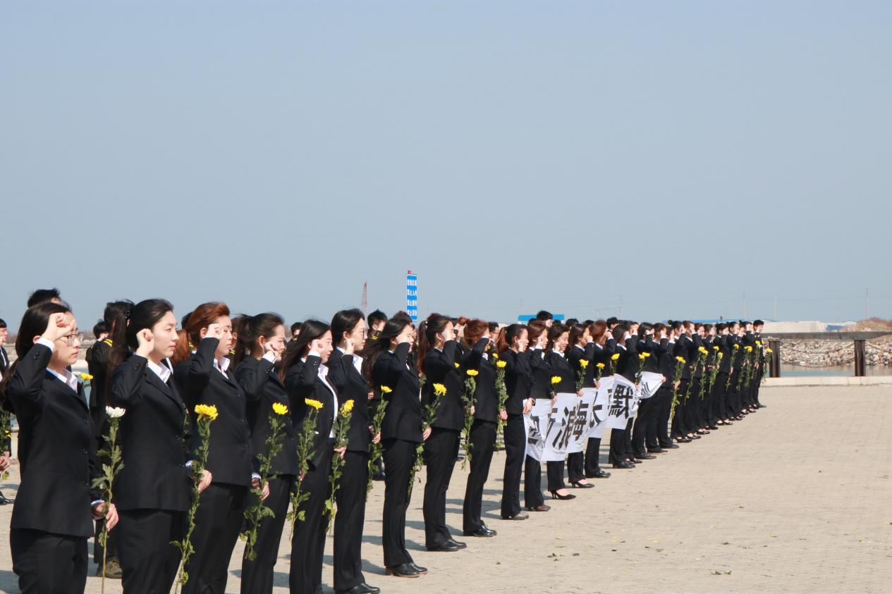 当日下午1点半,我院百余名师生身着校服,乘坐大巴车前往目的地。下车后布置好场地,全体人员手捧鲜花,庄严的矗立在码头广场中央,白色条幅上的赫然大字“迎风面浪祭海魂,长歌短默缅先烈”表达出对革命先烈的沉痛悼念。在团委书记李政的主持下,仪式开始。学生处处长张锡功致祭文后,伴随着哀乐,全体人员肃立,低头像革命英烈默哀。随后团委副书记赵梅带领同学们宣誓过后默哀一分钟。在学生处处长张锡功指挥下,同学们带着沉痛的哀悼之情将手中的花瓣依次撒入大海中。活动最后全体师生合照并清扫活动场地。