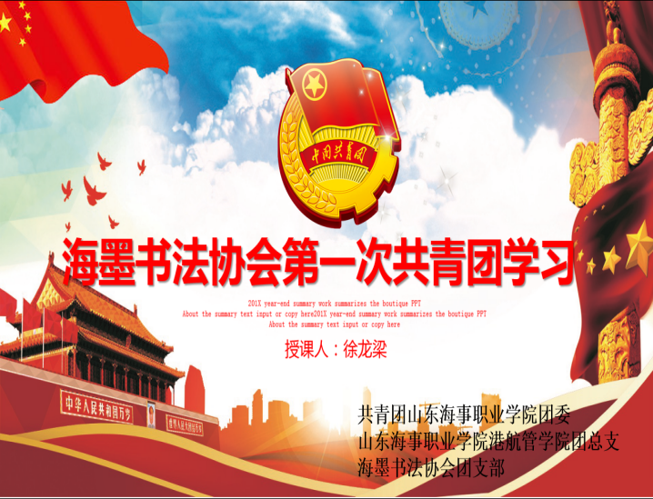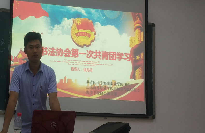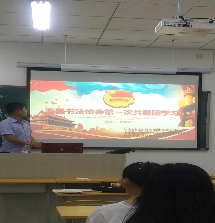 2018年6月18日晚港航管理学院海墨书法协会团支部开展第一期开展共青团知识学习,为深入学习贯彻党的十九大精神和习近平新时代中国特色社会主义思想,进一步加强对党的系统理论学习,努力创建中心学习型团组织。在共青团山东海事职业学院团委和港航管学院团总支大力支持下,港航管理学院海墨书法协会团支部组织海墨书法协会全体共青团员、进行集体学习,会议由港航管理学院团总支书记苑振冬主持,授课由书法协会会长、团支部书记徐龙梁。