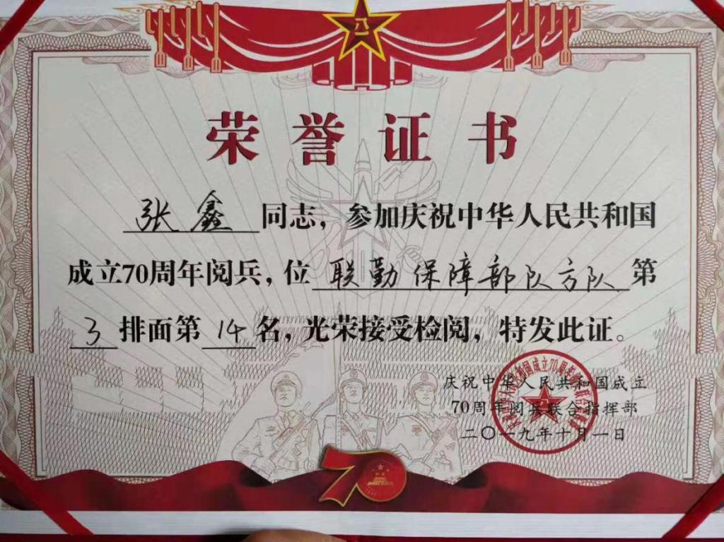 2018年9月,张鑫同学怀着对军人的梦想从地方应征入伍,现服役于南京军区某联勤保障部队。2019年3月,军训指挥部到部队选拔参加阅兵的士兵,他凭着坚韧顽强的拼搏精神和优秀的综合素质脱颖而出,光荣入选。