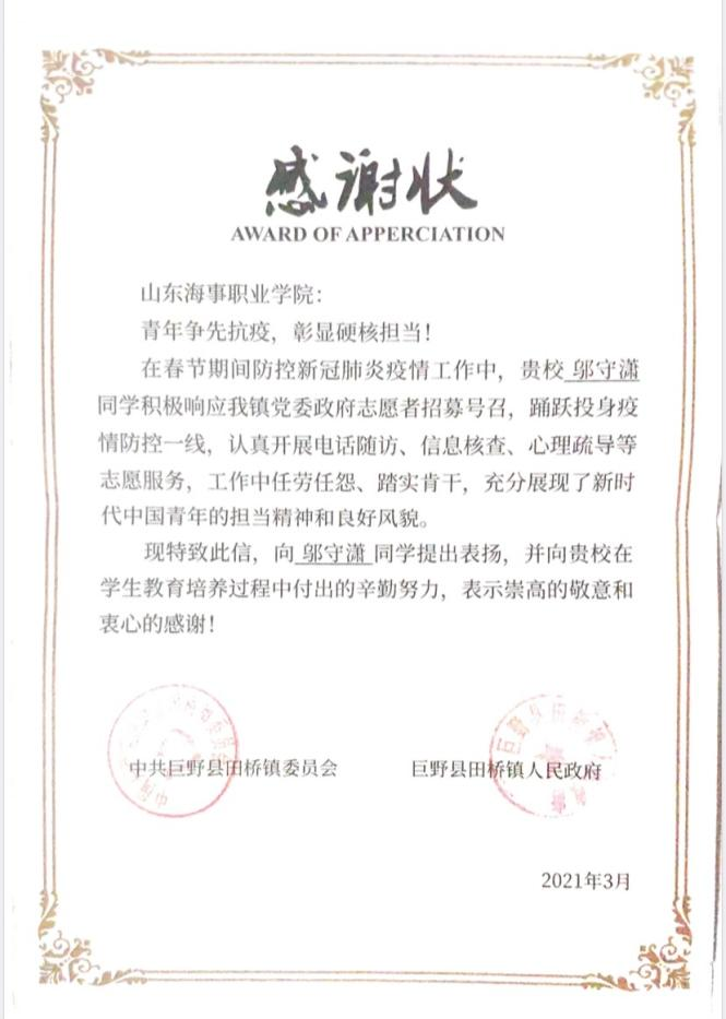 近日,港航学院收到分别来自中共曲阜市时庄街道崇文社区委员会、中共巨野县田桥镇委员会以及山蒙阴县旧寨乡旧寨村发来的表扬信,分别对我院19级会计3班马玉璐、19级港航2班邬守潇、18级港航1班马金鸣三位同学在抗疫当中的积极表现给予高度肯定和赞扬。