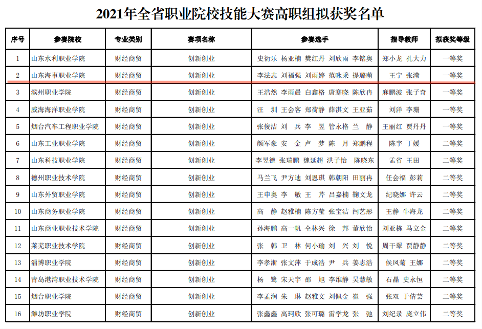 12月18日,2021年山东省职业院校技能大赛(高职组)“创新创业”赛项在山东水利职业学院举行,来自全省54所高职院校的270名选手同台竞技,经过激烈角逐,我校港航管理学院由李法志、刘福强、范咏乘、刘雨婷、提璐萌五位同学组成的参赛队在王宁、张滢两位老师的指导下获一等奖,实现了我校学生技能大赛项目的新突破。