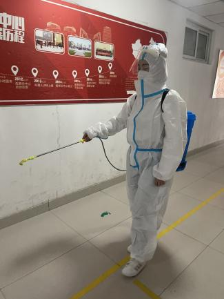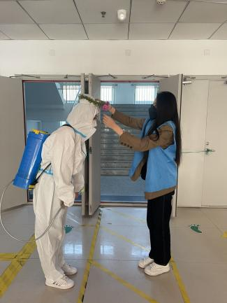 在这个春暖花开的季节,防护服穿上身,背上消毒器材,去教室、楼道各个学生所能触及到的地方消毒消杀。老师再忙再累,但每一个操作步骤都十分规范,确保排查工作全面,从而为疫情防控提供有力保障。而我院的同学理解老师的辛苦,悄悄为老师送上了最美的花环。