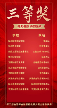 11月18日,由《当代金融家》杂志社主办、金智东博(北京)教育科技股份有限公司承办的2023年第二届“金育杯”金融智能投顾大赛全国总决赛落下帷幕。港航管理学院参赛团队“山海职院金融精英队”(队员:庄紫涵、钟华宏、尹玉丽、张誉腾,指导老师:程美旺、王颖)获得竞赛团队三等奖;指导老师程美旺、王颖老师获得“优秀指导老师奖”;认真组织学生实训训练、校赛选拔等,有序筹备参与竞赛,体现了良好的竞赛风貌,被授予“最佳组织奖”。