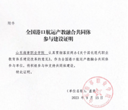 9.紧跟职教高质量发展步伐,践行“以教促产、以产助教、产教融合、产学合作”路径,港航管理学院“潍坊市现代物流产教联合体”副理事长单位,“国家港航产教融合体”成员单位。