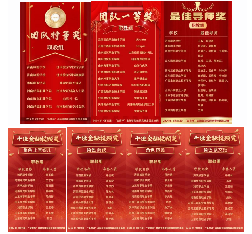 近日,由中国人民银行旗下的《当代金融家》杂志主办、金智东博(北京)教育科技股份有限公司承办的2024年“金育杯”金融智能投顾全国总决赛圆满落幕。本次竞赛汇聚了全国100多所高校参与,累计218支队伍在决赛中竞技。我校港航管理学院进入总决赛的两支参赛队伍凭借出色的表现,从众多参赛队伍中脱颖而出,分别获得特等奖、一等奖的好成绩,除了团队奖项,我校参赛选手周炳智、尹玉丽、朱加苏、李德谱、刘家栋、高泽宇荣获个人十佳投顾奖,张滢、王颖、程美旺、陈铭志四位位老师荣获最佳导师奖。这些荣誉的取得,不仅是对参赛队员个人能力的肯定,更是对我校金融专业教学水平的认可。