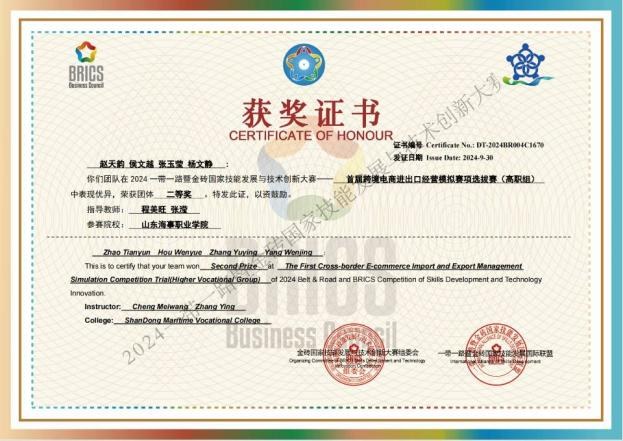 本次大赛由来自山东省99支赛队,396名选手参与云端决赛智能竞技。经过激烈角逐, 我校港航管理学院代表团队凭借出色的表现,在众多参赛队伍中脱颖而出,两支队伍均荣获二等奖佳绩。这次省赛二等奖的获得,不仅是对我校参赛团队努力付出的肯定,更是教育教学成果的有力体现。它将激励更多同学积极投身于各类学科竞赛与创新实践活动,为学校争得更多荣誉,推动学校人才培养质量再上新台阶。