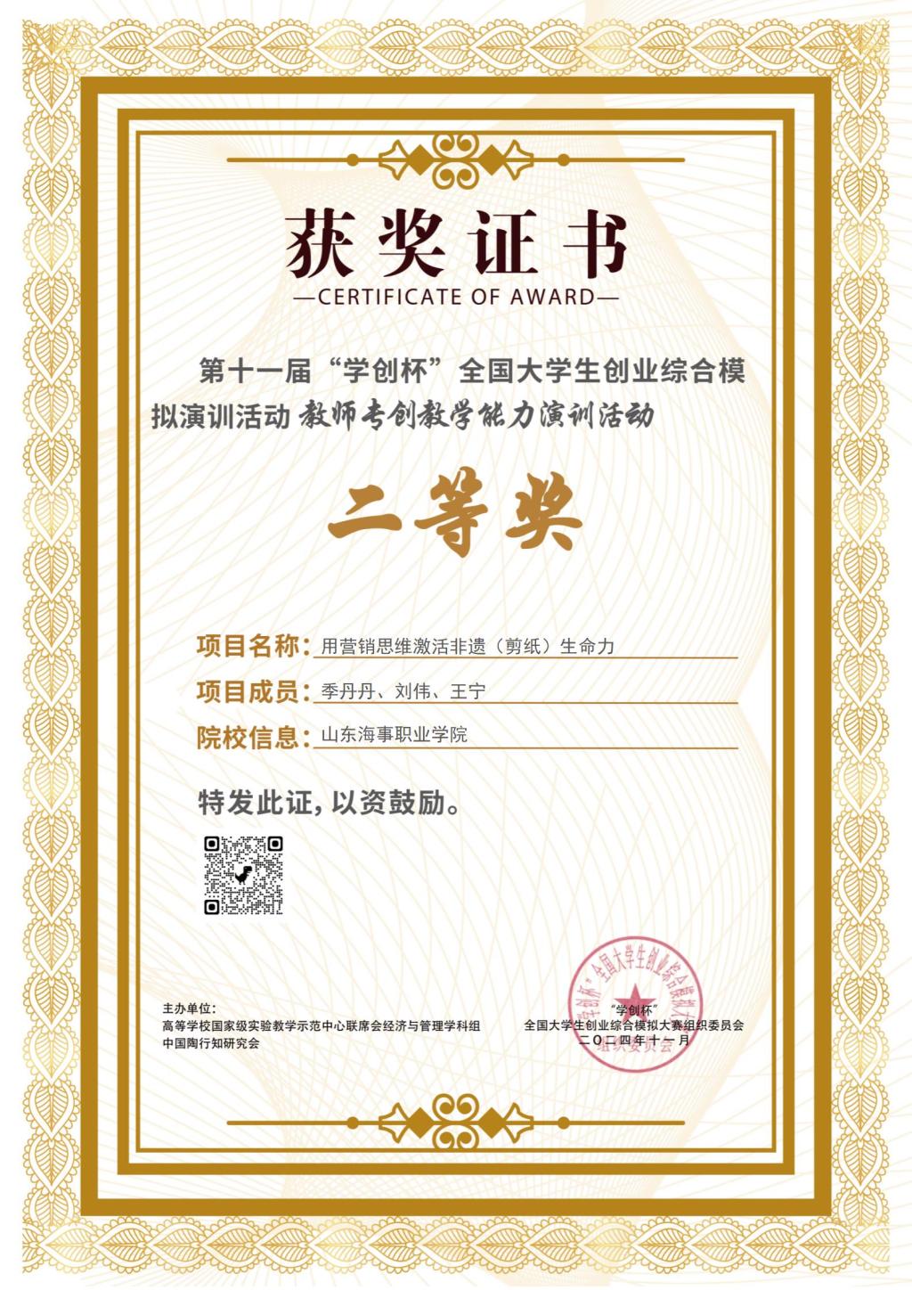 本次比赛为深化国内职业院校创新创业教育改革,促进创新创业教育与专业教育深度融合,以提高教师“专创融合”教学能力为核心,重点考察教学团队专创融合课程内涵建设,推动专创深度融合,是全国职业学院教师专创教学能力的大比拼。港航管理学院季丹丹、刘伟、王宁三位老师组成的参赛团队,认真备赛反复打磨专创融合教学方案,不断调整课堂应用环节和教学效果的评估,最终凭借《用营销思维激活非遗(剪纸)生命力》教学案例荣获全国二等奖。