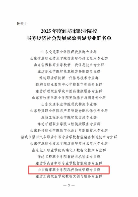 12月8日,潍坊市教育局公布了“2025年度潍坊市职业院校服务经济社会发展成效明显专业群”名单,我校现代物流管理专业群成功入选。